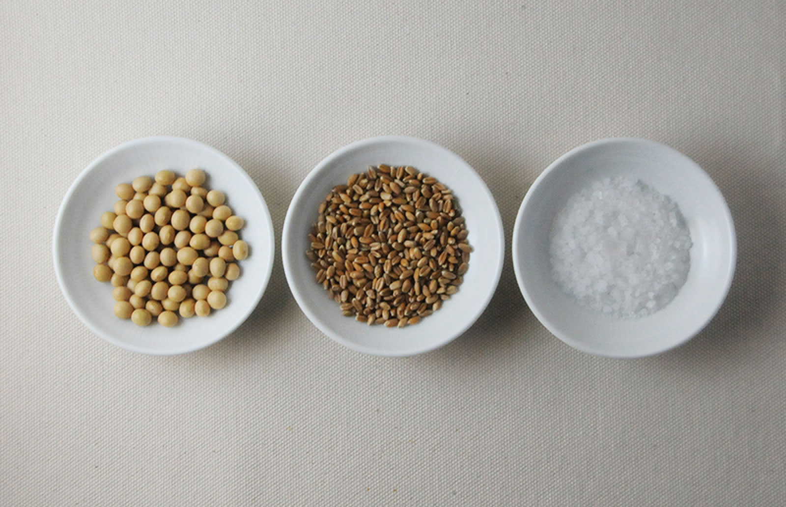醤油の基本原料は大豆・小麦・食塩。大豆のたんぱく質がうま味成分のアミノ酸に分解され、小麦のでんぷんが甘味や香りのもとになるブドウ糖に分解されます。そして、雑菌から守りゆっくり時間をかけて醸造させるのに欠かせないのが食塩です。